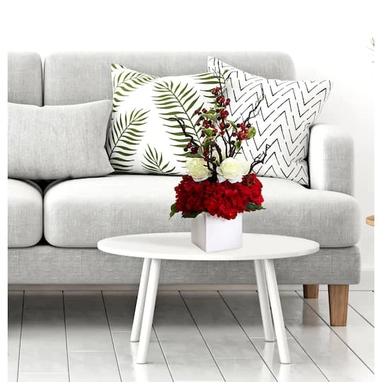Show your holiday spirit with this festive holiday cheer arrangement. Featuring beautiful hydrangea blooms, full roses, and lush berries backed by twisting twigs and green leaves, this arrangement is a virtual cornucopia of color and texture. The lush colors and petals burst forth from a stately white planter that completes the picture.