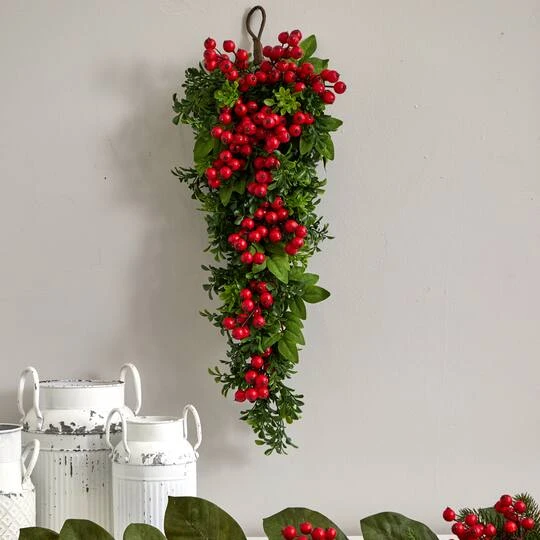 True-to-life boxwood hangs in a unique teardrop arrangement to cascade across the fireplace mantel, dinner table or entryway. Greet guests with faux seasonal berries, handcrafted and arranged to perfection for your holiday home. Contrast with white décor for a contemporary feel, or pair with rustic and antique seasonal finds for a farmhouse look.
