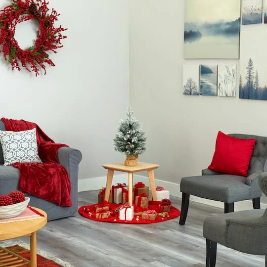 Create a winter wonderland scene in the smallest spaces with this flocked artificial Christmas tree. Entirely effortless, it boasts a full silhouette made up of bendable tips for showcasing holiday ornaments – completely flocked with faux snow to create a winter-inspired Christmas. Pre-strung with clear LED lights and stabilized in a burlap wrapped base, this 2 foot tall artificial Christmas tree will transform any tight space into a joyous holiday setting.Â