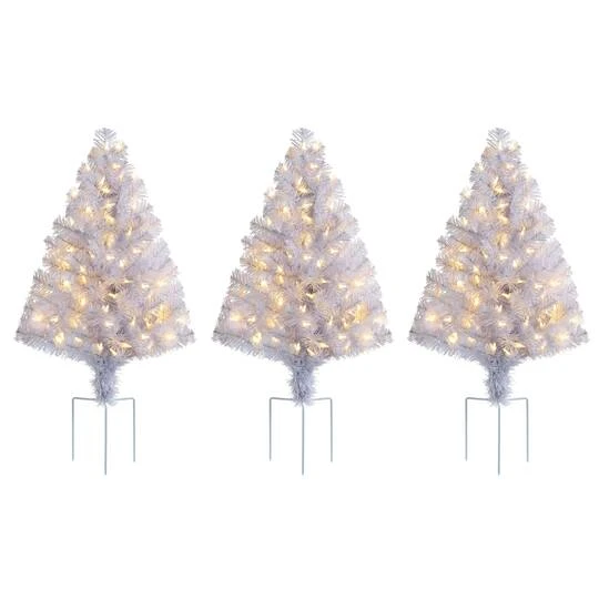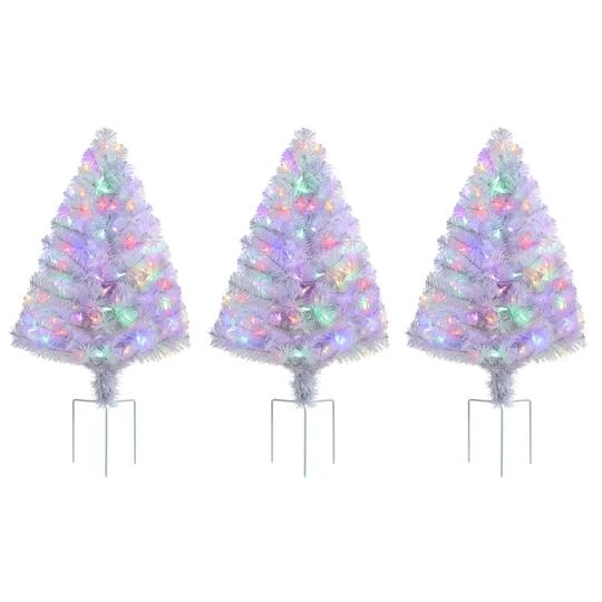 Mr. Christmas Alexa compatible Set of 3 Pathway Tree Lights. Each 31″ tree comes pre-lit with 70 lights. Alexa voice-activated lights with 12 lighting functions. Lighting your pathway, garden, or patio for the holidays has never been easier, and connecting to Alexa is as simple as plugging it in and using your voice, “Alexa, turn my Christmas lights on.” Customize your light strand to match your holiday décor; choose between an array of colors and fun functions to create a unique effortless display. This strand of 3 trees has 75″ between each tree and a 96″ lead cord.