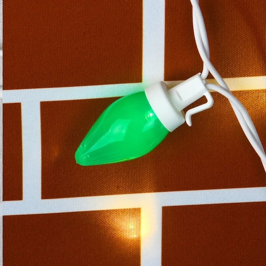 This colorful holiday decoration is made with reinforced fabric materials wrapped around wire framing creating a strong and durable holiday trimming. Awkwardly emerging from a red brick chimney, this red-nosed reindeer seems perplexed with his predicament. His large antlers are strung with multicolor C7 bulbs that fall in front of him. In addition to the light string, this decoration is lit from behind with warm white LED lights that create additional sparkle and shine.