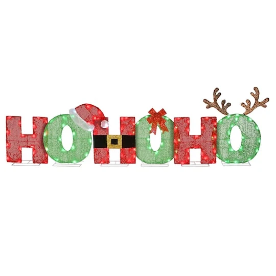 This decoration, featuring three sets of letters spelling āHO HO HO”, is constructed of a translucent glittered fabric material stretched over metal wire frames. It is lit from behind with red & white LED lights. Each letter is attached to a sturdy metal stand and ground stakes are included for outdoor display. Each two-letter H-O set is interconnected with electrical wire.