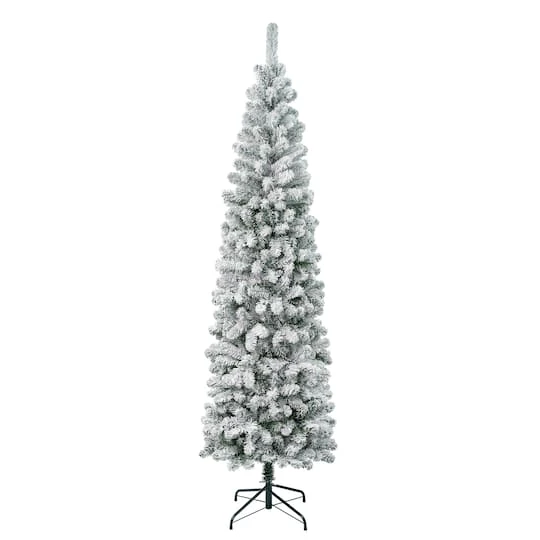 The Acacia Pencil Slim tree offers an extra thin profile making it a great choice for display in corners or in areas where floor space is limited. This tree features flocked branches giving the appearance of freshly fallen snow.