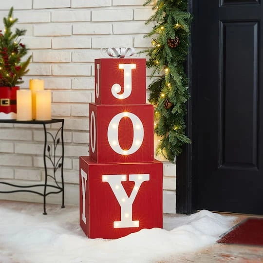 To decorate and celebrate this holiday with this wooden JOY boxes. The set features three wood boxes that could be stacked to build a jumbo sized nutcracker porch decorative piece, or you could have them nested to save space, an ideal storage solution. Classical red and white colors compliment all home styles in the coming holiday.